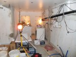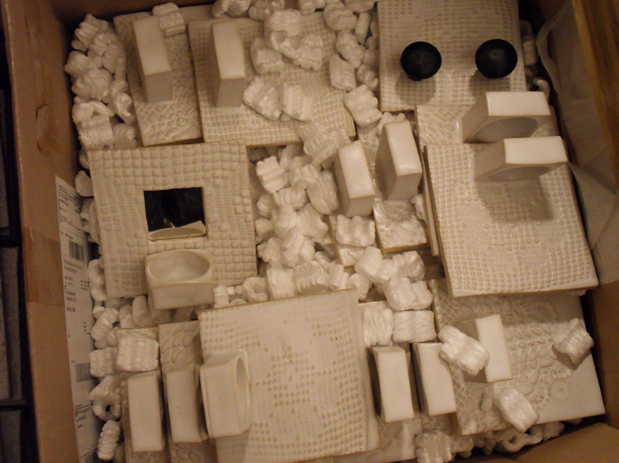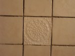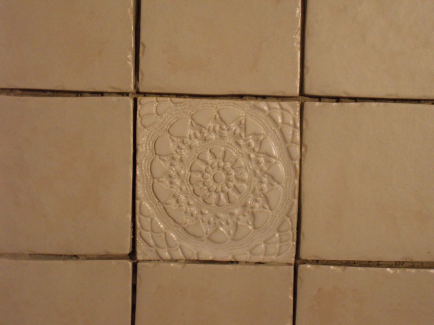 Är hemma i Hjo och har besökt badrumsbygget i mitt hus. Det är fortfarande tämligen kaotiskt men man börjar se ljuset, litegrann i alla fall. Kaklet har kommit upp på en vägg, blandat med vanligt kakel finns handgjorda plattor av keramikern Gunilla Sander, se foton nedan. Plattorna är mönstrade, några har spegel, andra ljuslykta och några med knoppar (fortfarande i lådan).