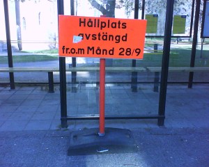 Bra planering i Skövde Publicerad den 04/05/2010 av Kajsa Johansson Var i Skövde igår och gick förbi denna busshållplats. Måste säga att det är bra planering att redan första dagarna i maj skylta om att en busshållplats kommer att vara avstängd från och med 28 september. Dela detta: Klicka för att dela på Facebook (Öppnas i ett nytt fönster) Facebook Klicka för att dela på X (Öppnas i ett nytt fönster) X Gilla Laddar in … Relaterade