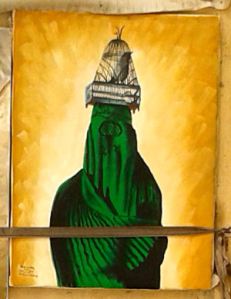 Vi kollade även på tavlor – vissa motiv förekommer i de flesta affärerna. Ett av dem föreställer en kvinna i grön burka som har en fågelbur på huvudet (se till vänster och tillsammans med andra tavlor nedan). Detta är inte direkt något som är vanligt förekommande här men som tavla verkar det vara väldigt populärt. Kanske kan någon konstlärd person förklara detta för mig.