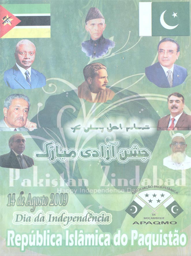 … om den islamiska republiken Pakistans självständighetsdag, den 14 augusti, följde med dagstidningen Notícias för några dagar sedan. Mocambiques president Guebuza är med på ett hörn och gratulerar i bilagan som finansieras av pakistansk-mocambikiska vänskapsförbundet…